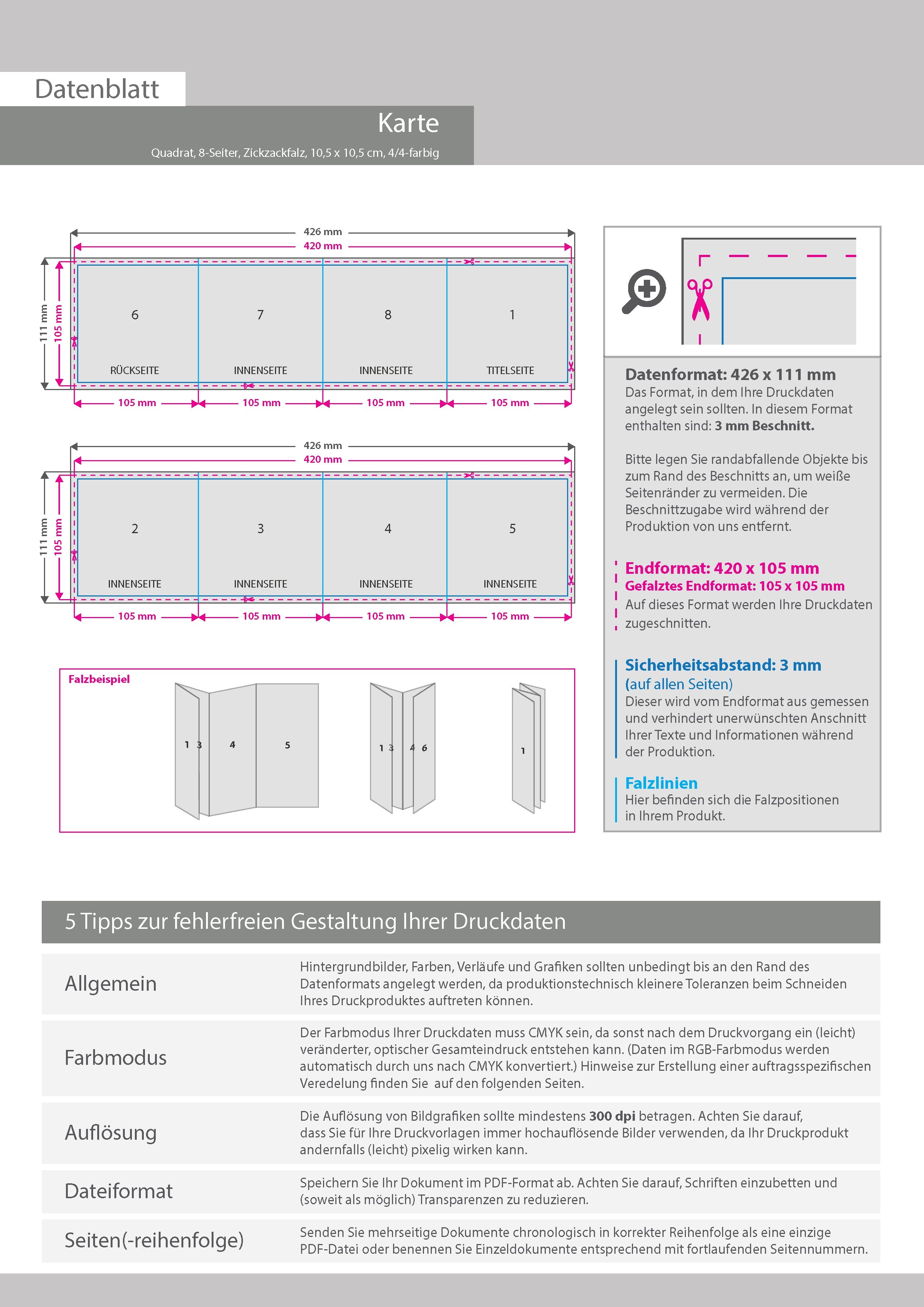 Geburtstagskarte, gefalzt auf Quadrat 10,5 cm x 10,5 cm, vertikaler Zickzackfalz, 8-seitig